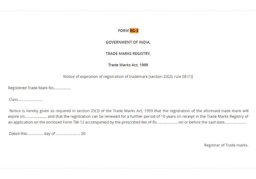 - The Trademark registrar is obligated to send a notice in Form RG-3 informing the proprietor about the approaching expiration date and the conditions to be met with for renewal of registration.