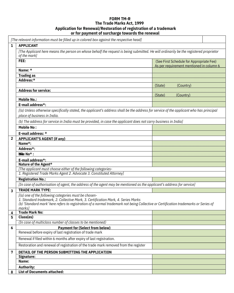 If the owner still does not respond, the Registrar will publish their intention to remove the mark from the Trademark Journal. The trademark renewal and restoration can also be done between 6 to 12 months of the expiration date by paying prescribed fees and surcharges. - In view of the above, The application to renew the registration of a trademark must be submitted using Form TM-R, along with the fee outlined in the first schedule. This application can be filed at any time up to one year before the expiration of the trademark’s last registration. However, it is always advisable to file before 6 months of the expiry of the trademark. Renewal is also possible within six months following the expiration date of the registered Trademark.