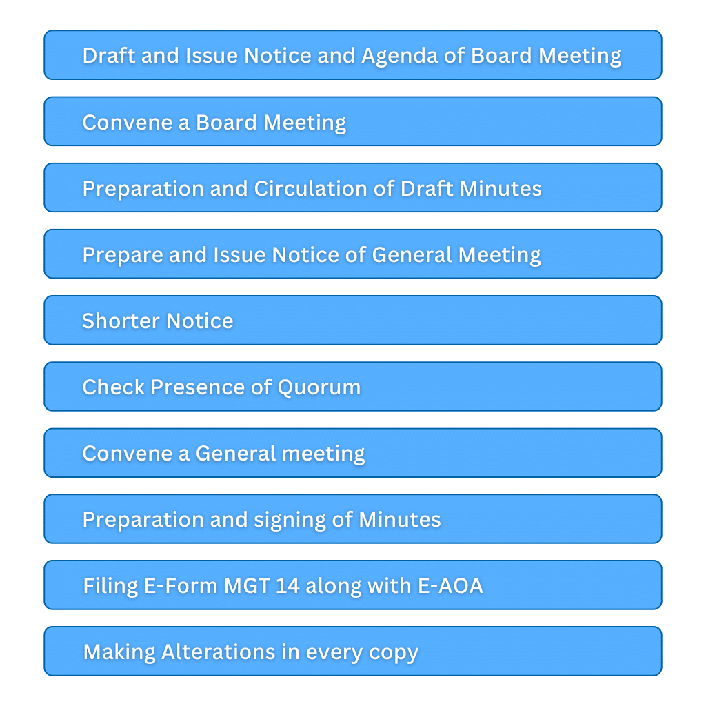 The company is required to file E-Form MGT 14 on the MCA Portal along with E-AOA and necessary attachments by paying requisite fees. Alteration in the Articles are required to be made in E-AOA.