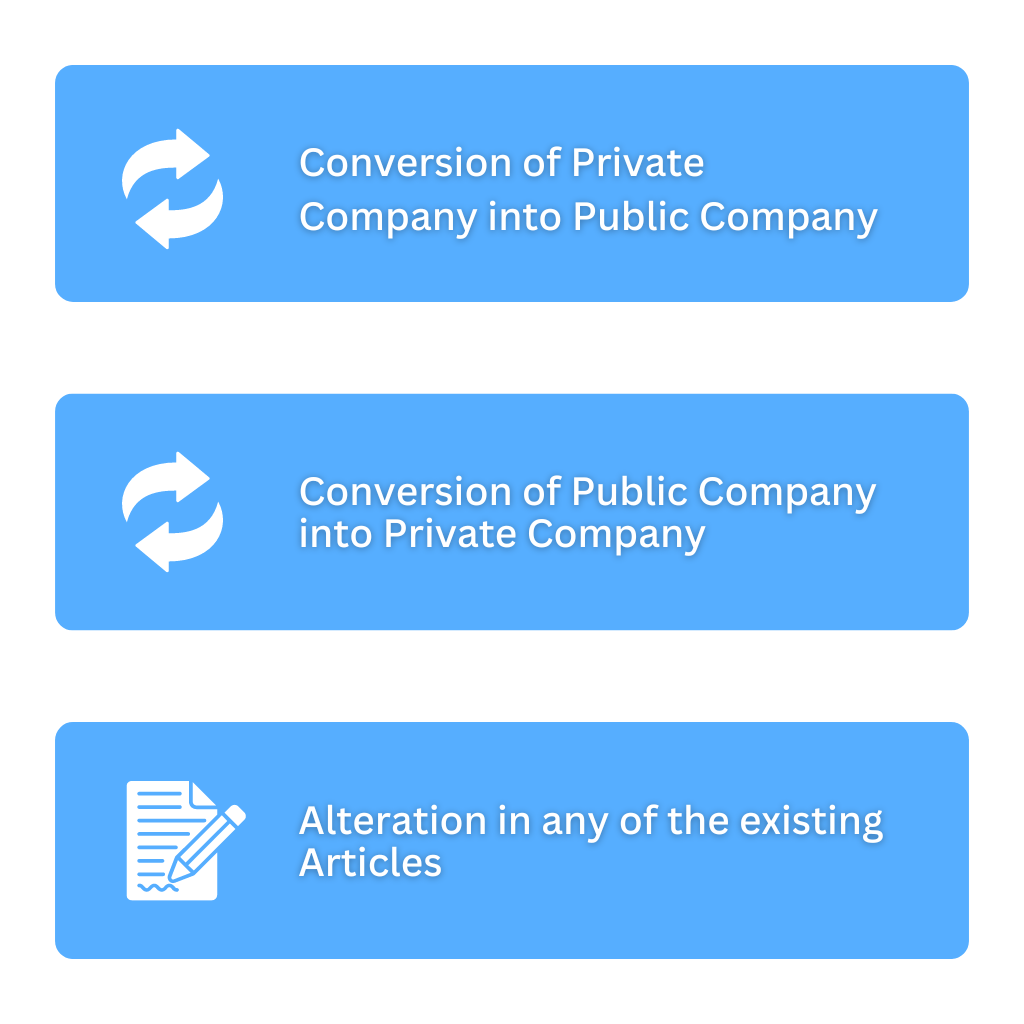 Subject to the provisions of the Companies Act, 2013 and conditions contained in its memorandum, if any a Company can alter its articles through a Special Resolution, resulting in conversion of Private Company into Public Company. If a private company alters its articles in such a manner that they no longer include the restrictions and limitations which are mandated to be included in the articles of a private company under the Companies Act, 2013 the company shall cease to be a private company from the date of such alteration,