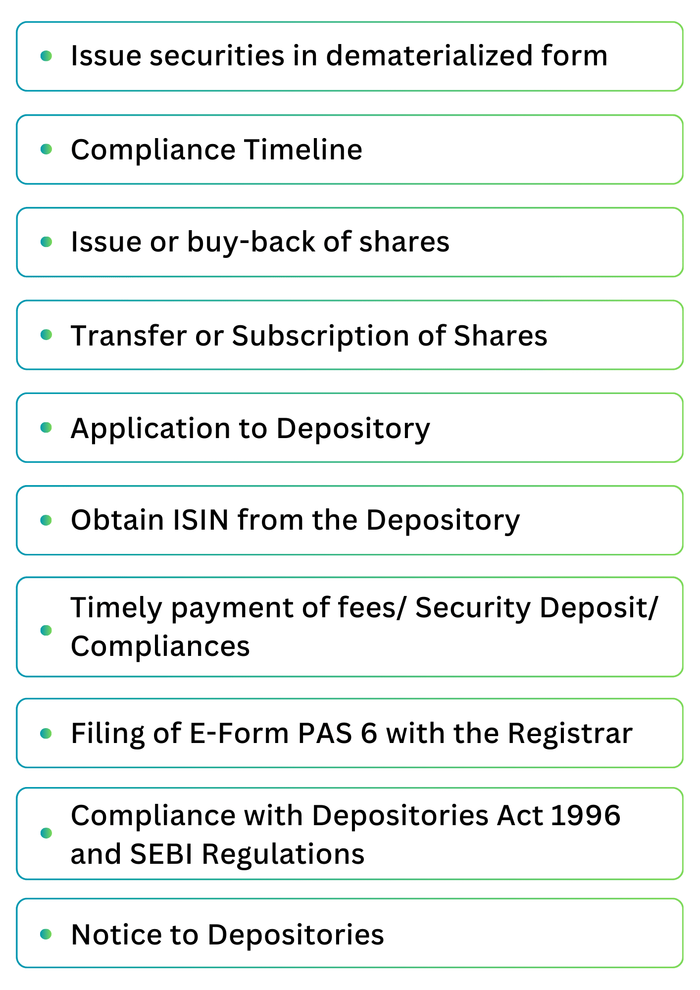 Listed Companies, Unlisted Public limited companies, non-small private limited companies, Section 8 Companies, Subsidiary of a Foreign or Indian Company, Producer Companies (non-small), Dormant Company (non-small), a wholly owned subsidiary of a private company, Non- Banking Financial Companies are subject to mandatory dematerialization of securities.