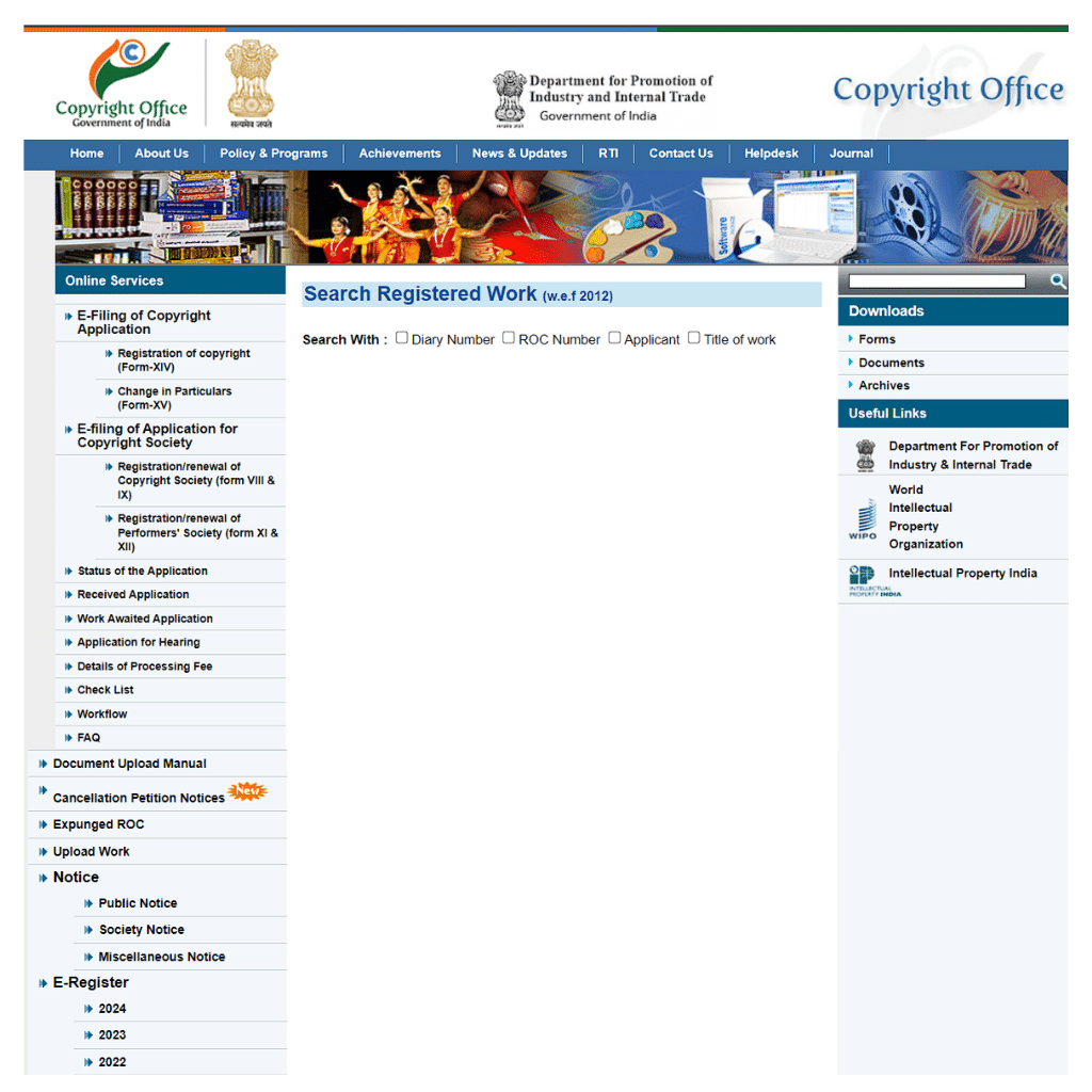 Before applying for copyright registration, the applicant needs to visit the official website of copyright (https://copyright.gov.in/SearchRoc.aspx) and click “Search Work” to check whether a particular work can be registered or not. Search can be made with the following options: