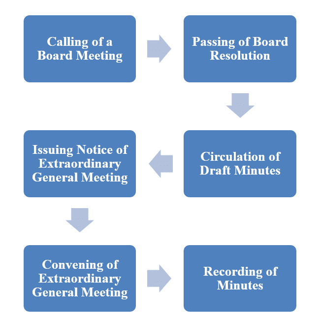 2) Passing of Board Resolution – In a duly convened meeting of the Board of Directors, pass a resolution fixing date, time, and venue of the extraordinary general meeting to be held. Also, approve the draft notice of the extraordinary general meeting and explanatory statement to be annexed with such notice (if any).