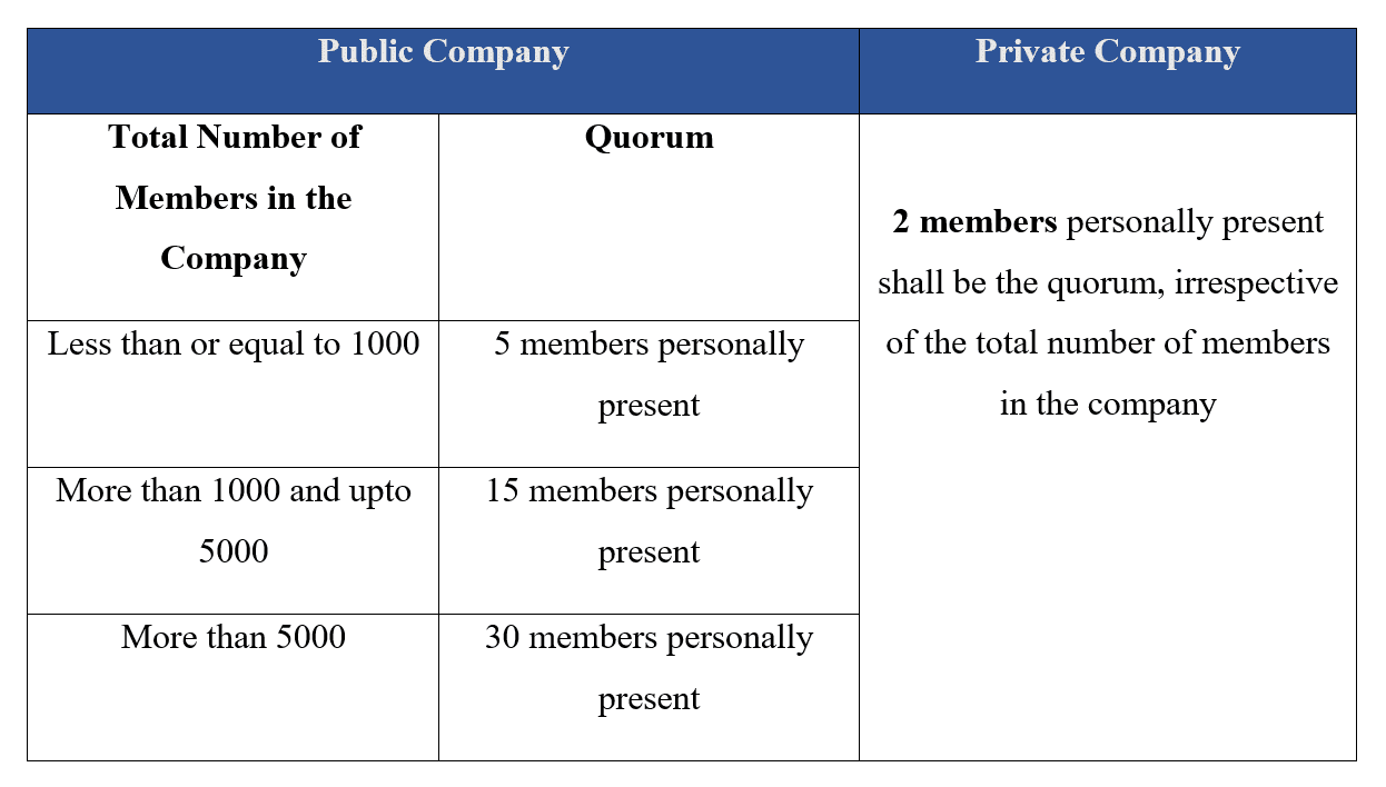 Section 103 of the Companies Act, 2013 contains a provision regarding quorum for general meetings i.e., the minimum number of members required to be present in person, in order to convene a valid meeting. The following table shows the requisite quorum for general meetings (including extraordinary general meetings) in the case of a public company and a private ltd company –
