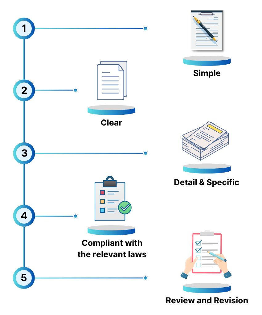The agreement drafted should be detailed and specific and it must serve the purpose of the subject matter of the agreement. It must contain all the important clauses i.e. dispute resolution clause, confidentiality, waiver, and governing laws.