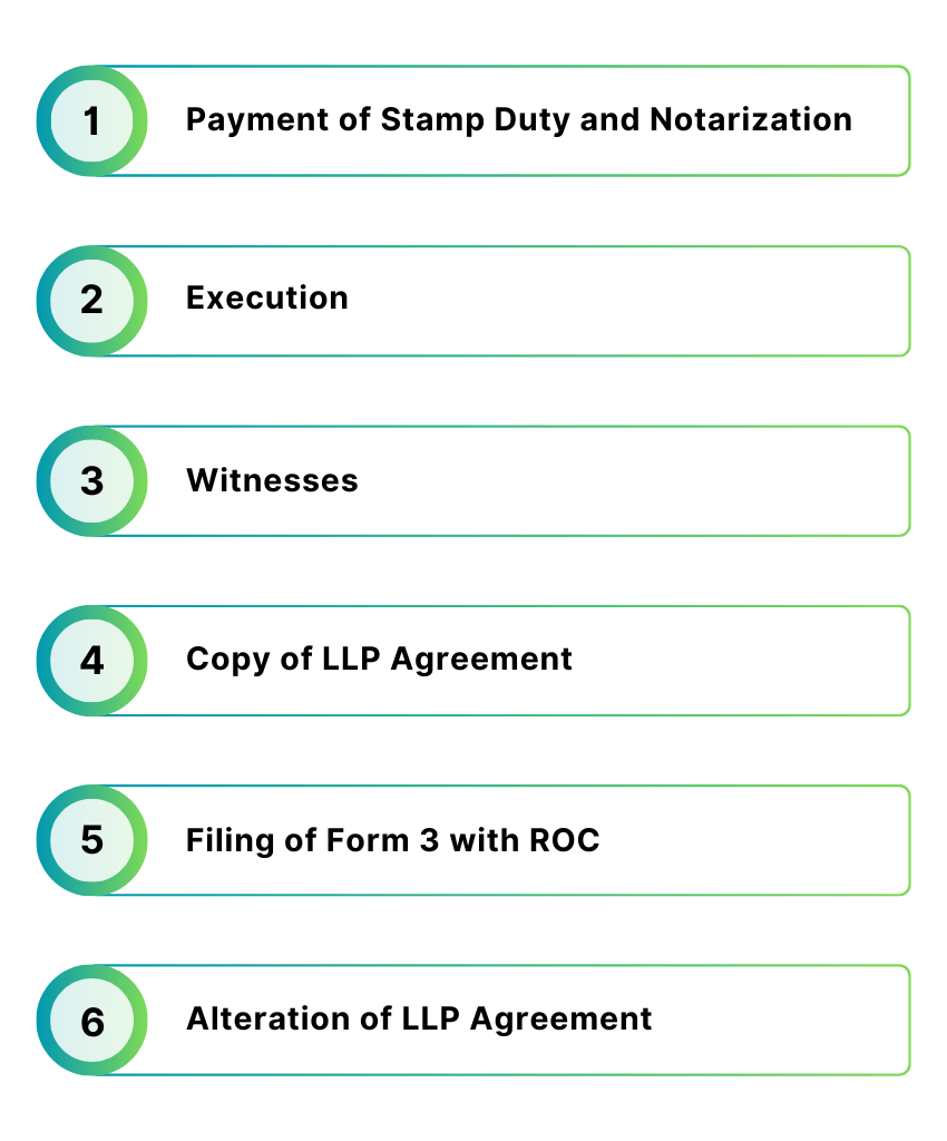 The LLP Agreement must contain the place of execution of the agreement as it helps to ascertain the jurisdiction of a document as to its registration, legal remedies for breaches committed by either party to the document, and also for determining the stamp duty payable on a document as it differs from State to State. Also, the date of commencement of LLP should be specified in the LLP Agreement.