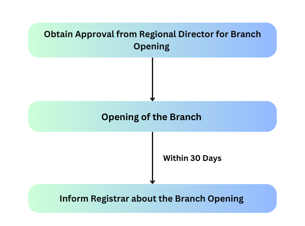- For opening more than 3 branches within the same district or a branch outside the district, a Nidhi Company shall follow the below procedure –